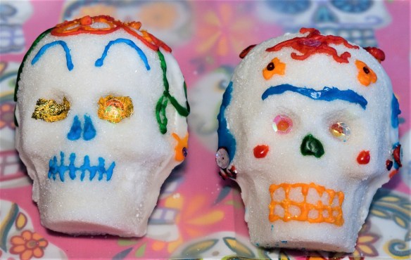 There is nothing grim about these skulls; they are decorated with colorful edible paint, glitter, beads, and sport huge smiles.Sugar Skulls are part of the Ofrenda,  a collection of offerings dedicated to the person being honored.A brightly colored oilcloth covers the table and on top of that sits a collection of photographs and personal items of the departed person. The lower portion of the altar is where the offerings are placed, from traditional Mexican cuisine to other items that represent the honored person’s particular tastes.All in all, the Day of the Dead celebrates life — the afterlife. And our connection to those who wait on the other side.