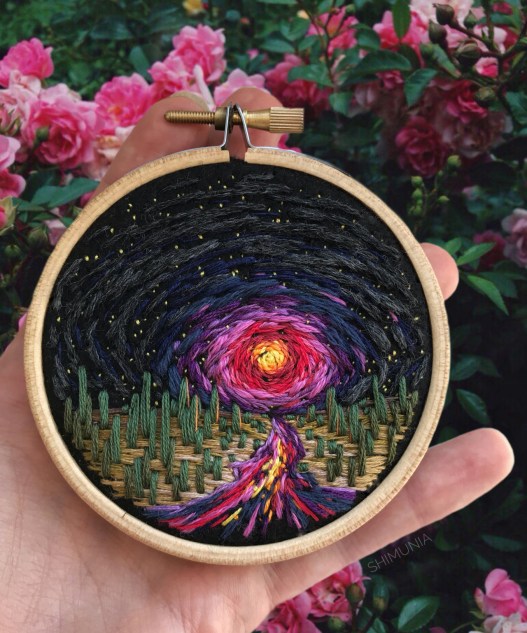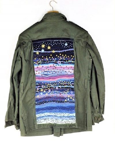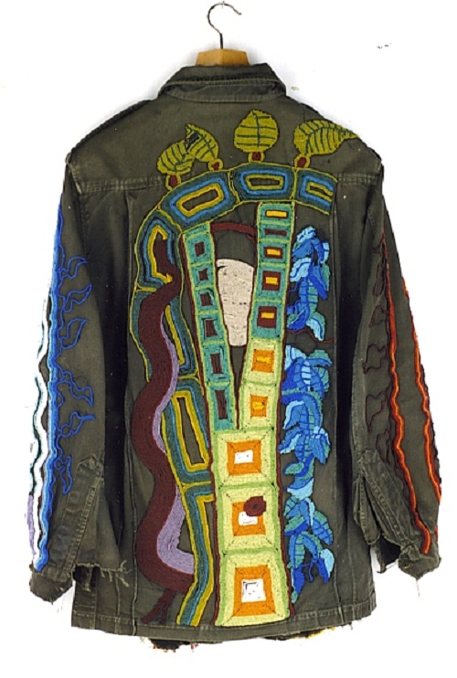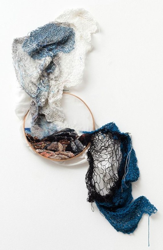 “Through a process of working from muscle memory in a meditative state, I see patterns of time travel and architecture, tapping into ancient skills and archetypal symbols while dwelling in the intimacy of fibers and skin.”
