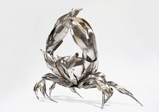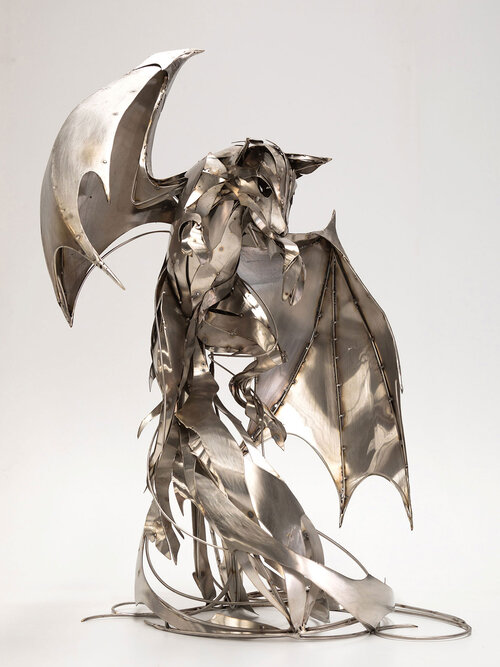 Comprised of numerous pieces cut from metal sheets, the materials lend themselves to organic forms like feathers, scales, wings, or the armaments of crustaceans.