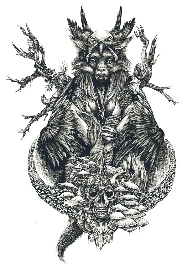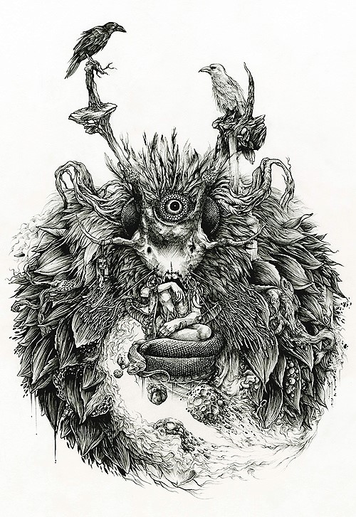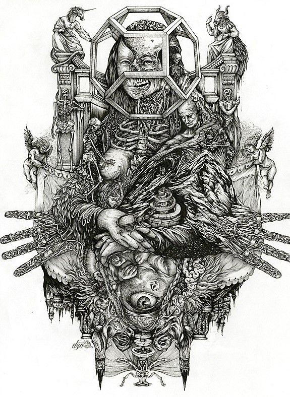 His art speaks to the old etchings and engravings of religious and occult manuscripts while it flirts with alchemy, witchcraft, and blasphemy.