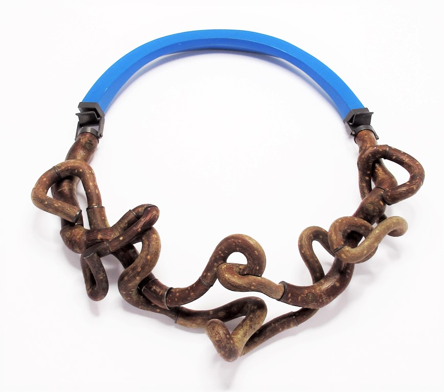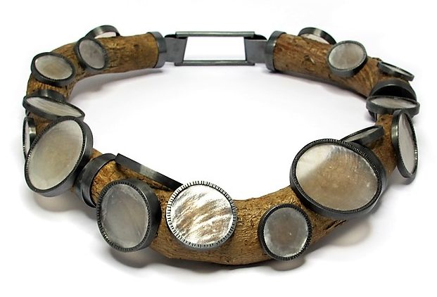 Terhi Tolvanen was born and raised in Helsinki, Finland, and studied silversmithing at the Lahti Institute of Design and Fine Arts.She moved to Amsterdam in 1993 to attend the Gerrit Rietveld Academy and the Sandberg Instituut, from which she graduated with a master’s degree.Though she began with silver, Tolvanen later began to and make sculptural jewelry using unconventional materials.The artist is revered for her observations of nature transformed into stunning, sculptural jewelry.Juxtaposing wooden branches with silver metalwork, concrete, pearls and stone, her wearable sculptures transcend expectations and norms. Her repertoire of materials is amazing: silver, metalwork, concrete, opals, light and dark pearls, stone, and more; woods include cherry, Corkscrew willow, hornbeam, pear, heather, lavender, and elm.This amazing artists creates all forms of jewelry, but for this showcase I chose her necklaces for display.Tolvanen makes no compromises, yet they feel comfortable in their scale as they are comfortably built for wear, as if nature intended them to be just as they are, and for them to be worn.“I feel as if making jewelry is a dance,” Tolvanen shares. “I feel I should go along with materials, not work against them. What I’m trying to do is isolate the best in the material, to use it in a logical way.”More of Terhi Tolvanen‘s unusual and wonderful jewelry can be found at https://www.terhitolvanen.com/.