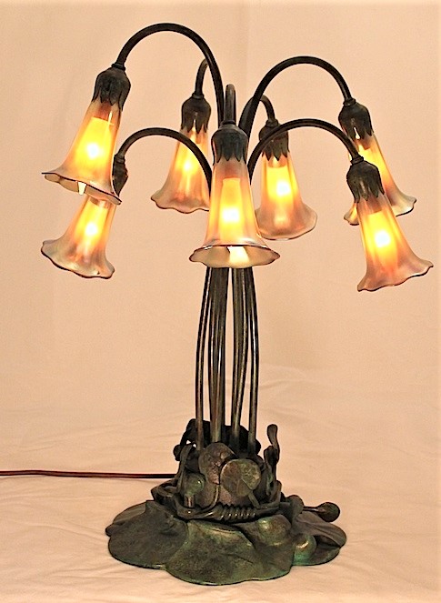 A Tiffany Lamp is a type of lamp with a glass shade made with glass designed by Louis Comfort Tiffany and his design studio.Famously associated with the Art Nouveau movement, the extravagantly decorative Tiffany lamps are rare and highly-sought collectors’ items.Hand crafted, the iconic stained glass lamps, lamp shades, lights and window panels were created by soldering together small pieces of colored glass to produce enchanting and individual objects.Genuine Tiffany lamps were made between 1890 and 1930.Tiffany studios used confetti glass which changes color when the lamp is lit. They have a bronze base; however, there were no zinc, wood or plastic versions.Over twenty years of time, Tiffany designed many specific styles of his lamps.Most of his luminaries can be grouped into one of seven specific categories, defining their detailed characteristics: the Irregular Upper and Lower Border, Favrile, Geometric, Transition to Flowers, Flowered Cone, and Flowered Globe Lamps.Genuine Tiffany lamps can be found at reputable dealers and websites across the Internet.