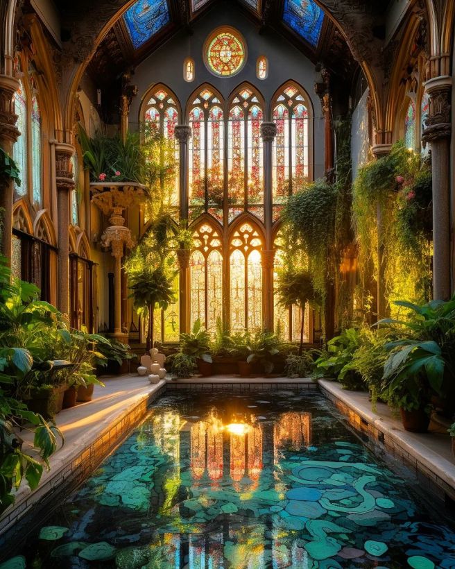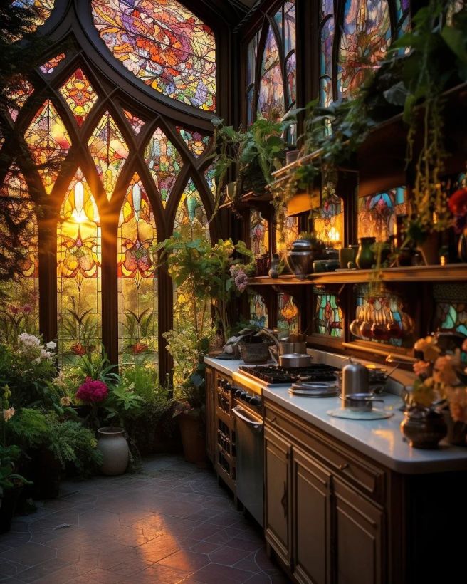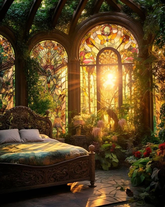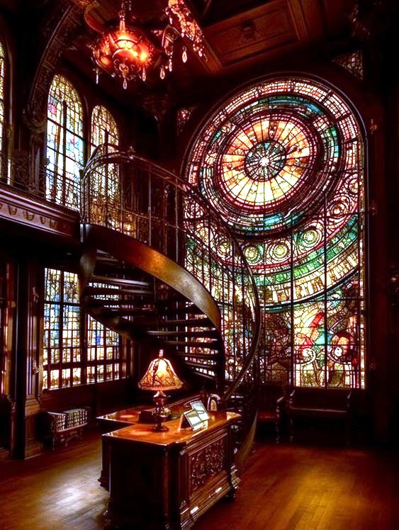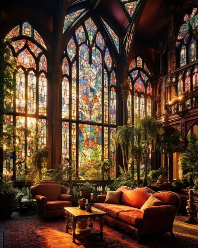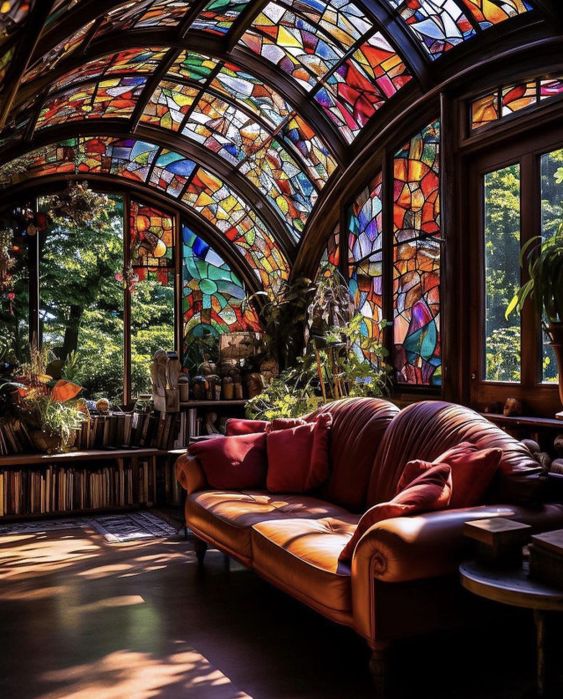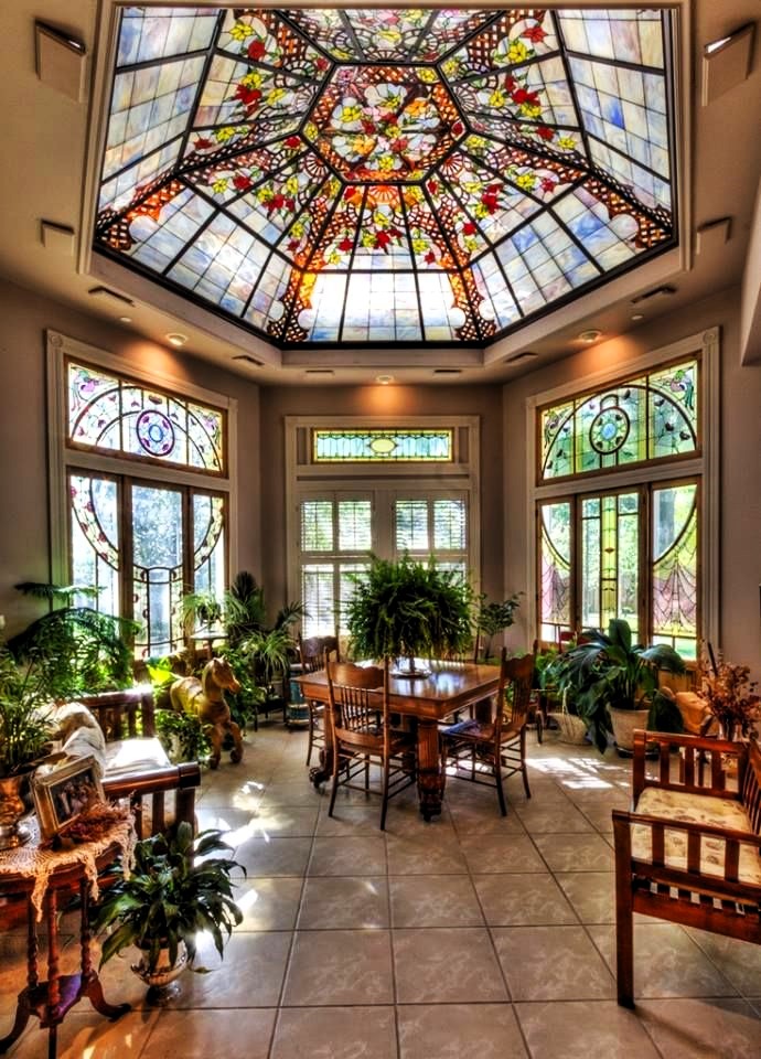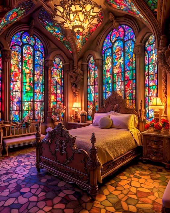 You know how one thing leads to another and another and another. Well, a few amazing stained glass room pictures showed up on my Internet feed, and before you knew it, I was collecting images of stained glass rooms.