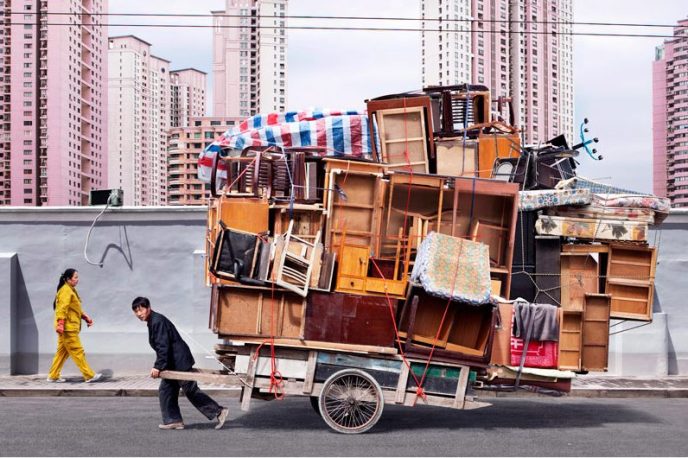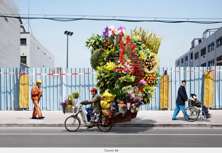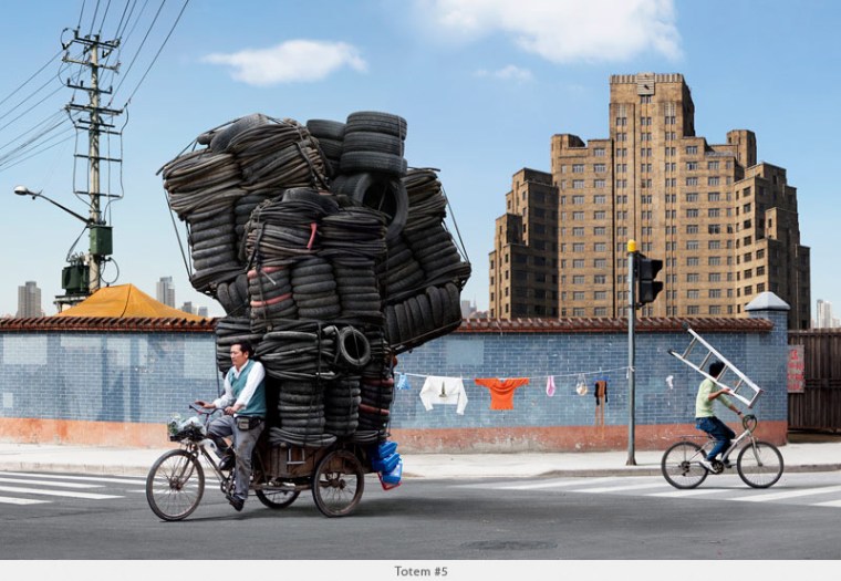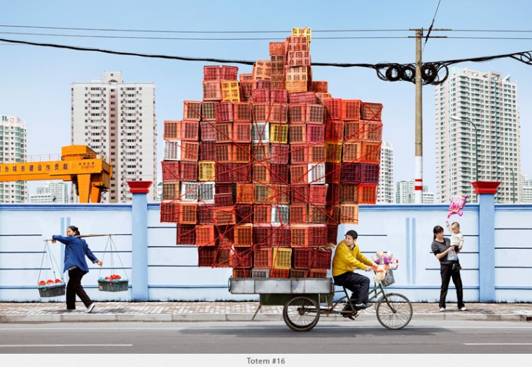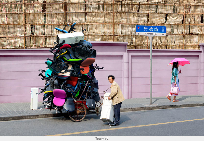 Inspired by the men on bicycles toting impossible mounds of objects he witnessed in Shanghai, French photographer Alain Delorme defies physics with his “Totems” series.