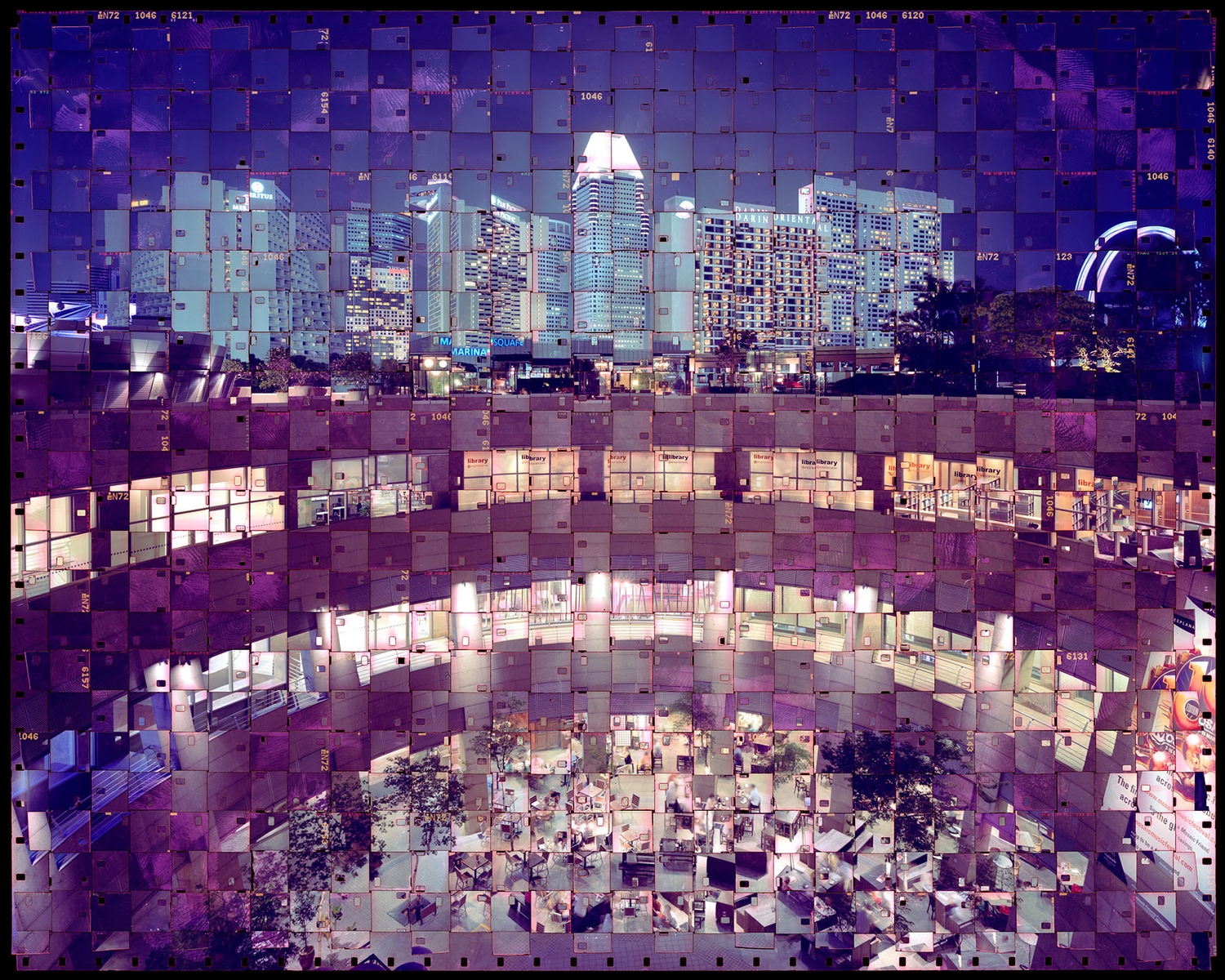 Each image begins with 8mm or 16mm camera film strips which he lays down in rows to create a larger surface that effectively acts as a single piece of film.