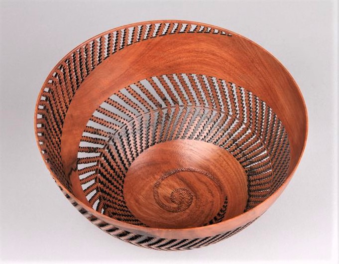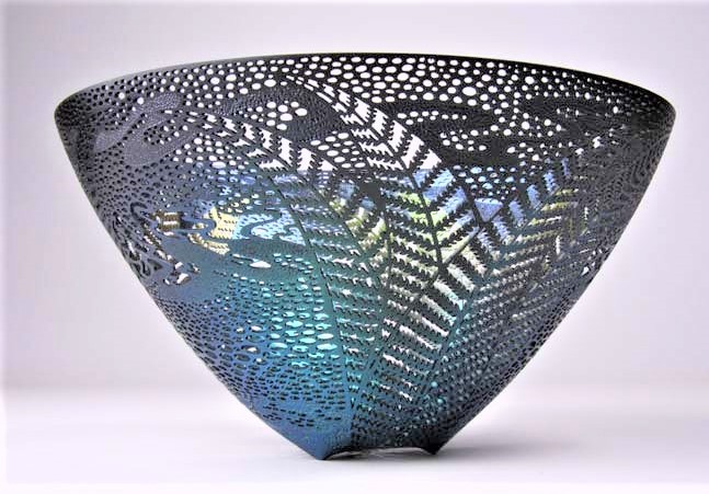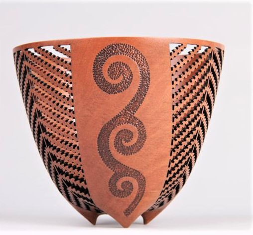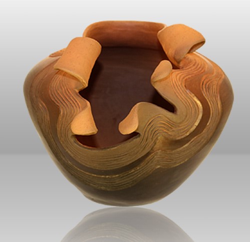 The firing process involves bringing the kiln up very slowly to a temperature of around 1300 degrees and then it is turned off and watched until it hits 990 degrees. After the firing, the piece is lifted out with Kevlar gloves and placed in sawdust to “smoke” the pot in the old Pueblo style tradition.