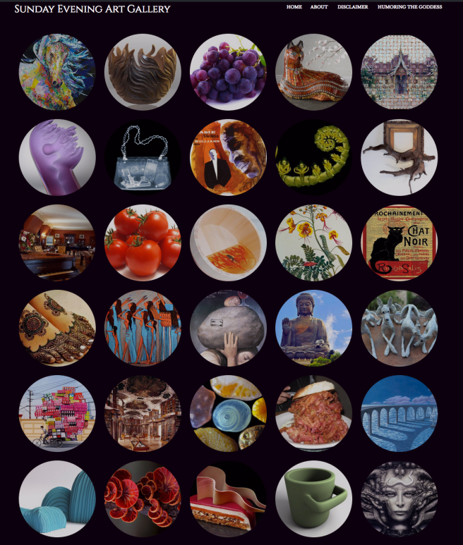 Tell your family — tell your friends — every Sunday evening, and perhaps every Thursday evening, you will find magical art and artists here at Humoring the Goddess, then in excess at the Sunday Evening Art Gallery.