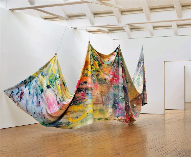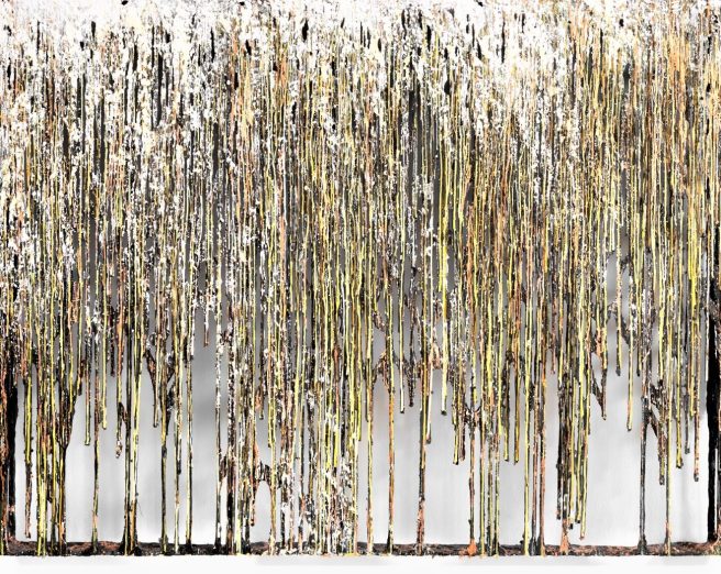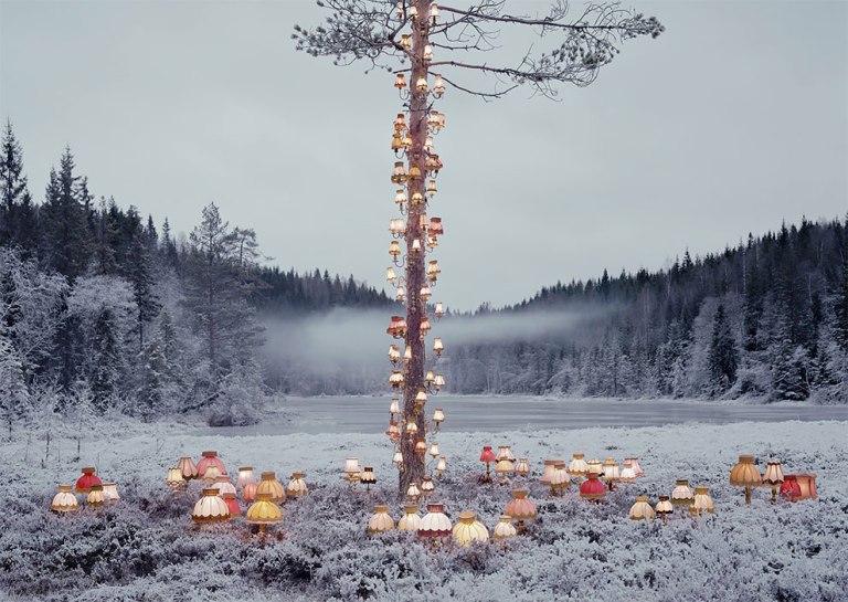 The forest becomes a studio, forming a backdrop to contextualize the work, so that each piece draws on its location, a golden tree introduced into a thicket shimmers in the darkness, painted paths snake through the undergrowth, and strands of wool are woven between trees mirroring colors and formal elements within the space.